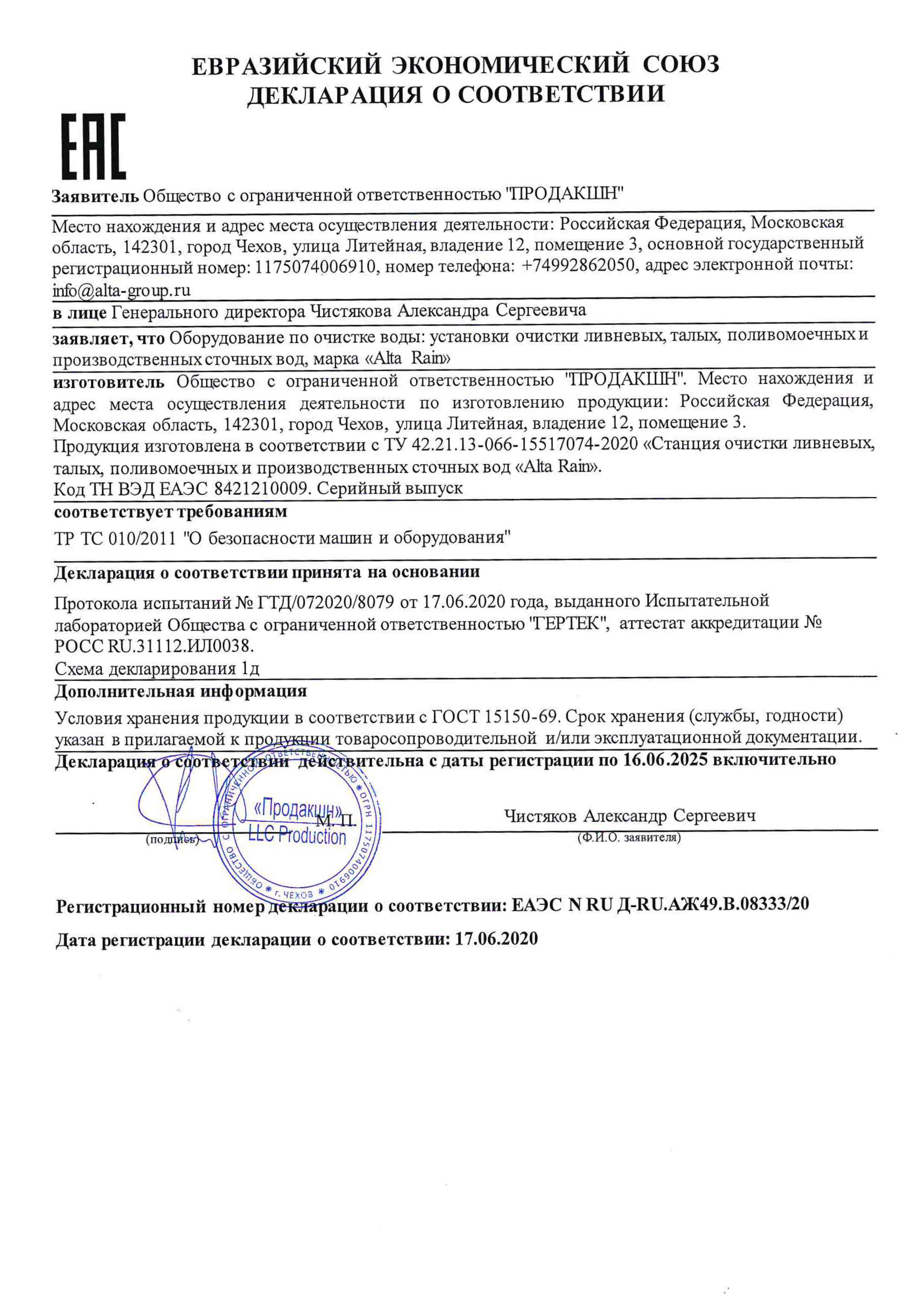 Состав очистных сооружений Alta Rain 10
